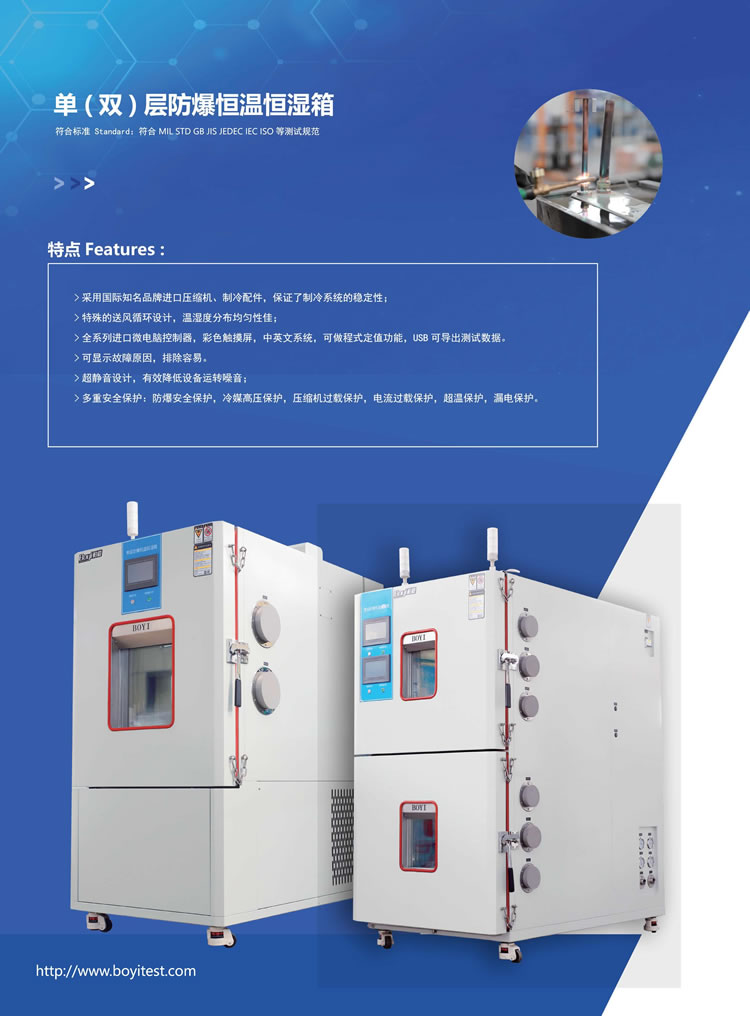 防爆恒溫恒濕試驗箱主要適用鋰離子電池,鉛酸電池,鎘鎳電池,鎳氫電池包生產(chǎn)或試驗及溫度模擬。支持電池組循環(huán)壽命試驗,高溫存儲,濕熱循環(huán), 冷啟動,凝露試驗,電池容量試驗,充放電特性試驗,荷電保持能力試驗,充放電效率試驗等。