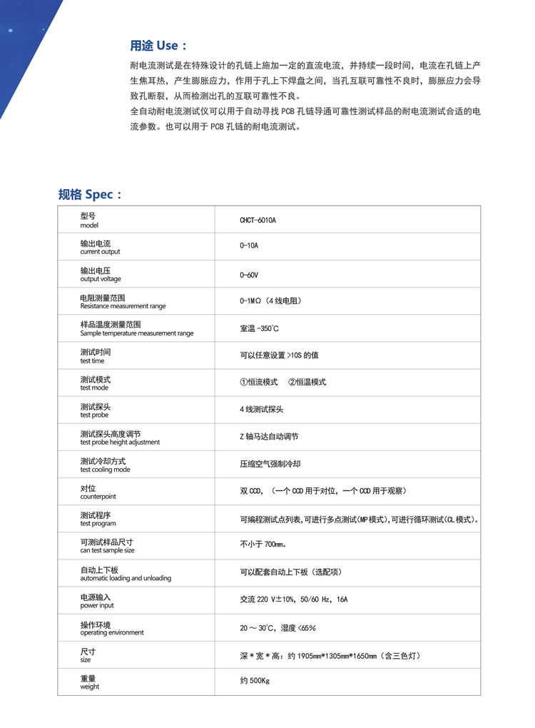 HCT耐電流測試系統(tǒng)(High Current Test System)又稱耐電流測試儀、耐電流測試機是一種用于測試和評估電氣設備在高電流條件下的性能和可靠性的測試系統(tǒng)。這種測試系統(tǒng)主要用于檢測電氣設備在極端電流條件下的耐受能力,以驗證其在實際應用中的安全性和可靠性??梢詼y試電子元器件、電路板和電子設備在不同電壓、電流等工作條件下是否穩(wěn)定、是否符合安全、可靠性和性能要求的測試儀器。主要作用是檢測和評估電子設備的耐電流能力,也可以用來測試PCB的電氣性能和損壞情況。